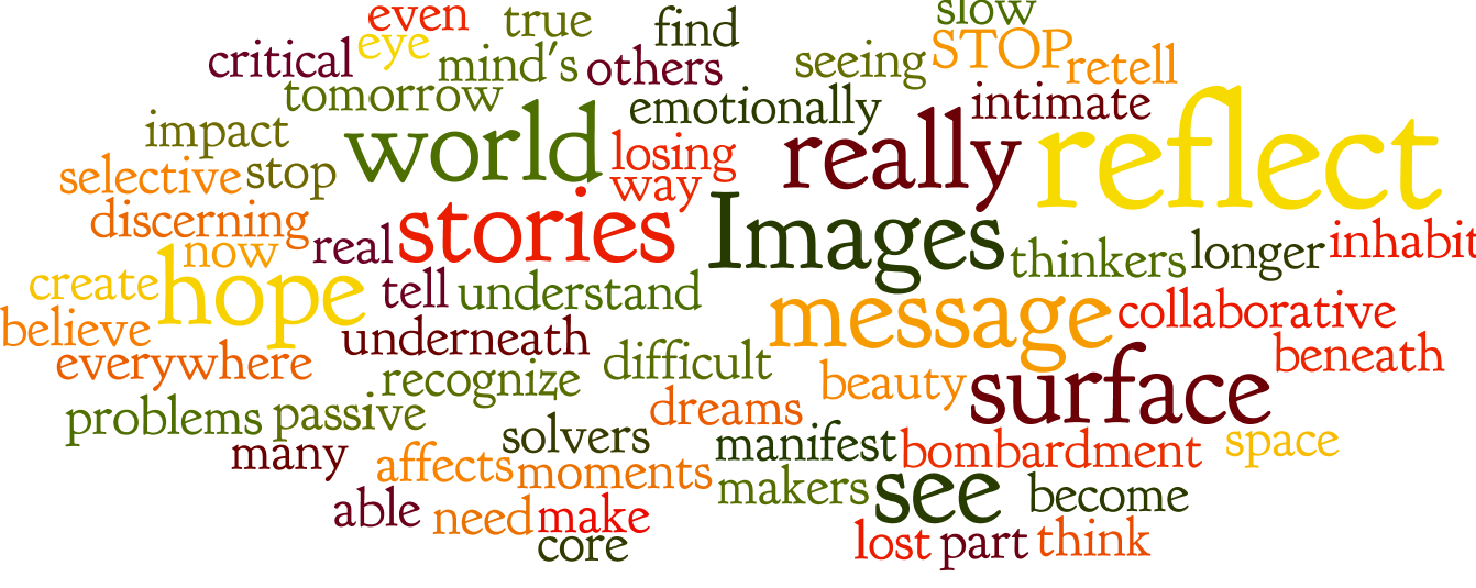 Images, they create our world. They inhabit our space.They reflect what’s in our mind’s eye. and are at the core of what we believe in What we hope for The beauty we see in others, in ourselves The hope we find, even in difficult moments Images are an intimate part of our world, and they are everywhere. But how do we reflect on them now with so many at once? Are they losing their impact? Do we really understand the message? Or is it lost in the bombardment? What do we need to do to make it STOP? We can no longer be passive. We have to be more discerning, more selective, more collaborative. We have to recognize the stories, on the surface and underneath, and retell them in our own way or tell our own stories. We have to slow down, stop, reflect, think about what we’re seeing, why it’s there, how it affects us, what it does to us emotionally and why. When we are able to do this, we see beneath the surface to what is really there. And only then do become the real message makers, the critical thinkers, the true problems solvers who manifest the dreams of tomorrow.
